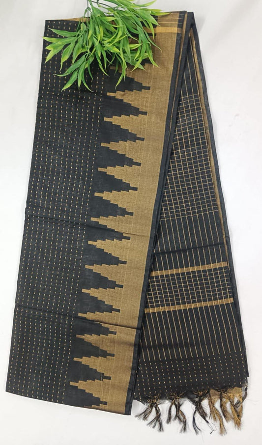 NVLCTB002-Linen cotton Temple border saree Black Color