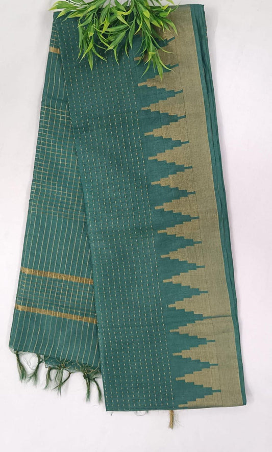 NVLCTB007-Linen cotton Temple border saree Dark Green Color