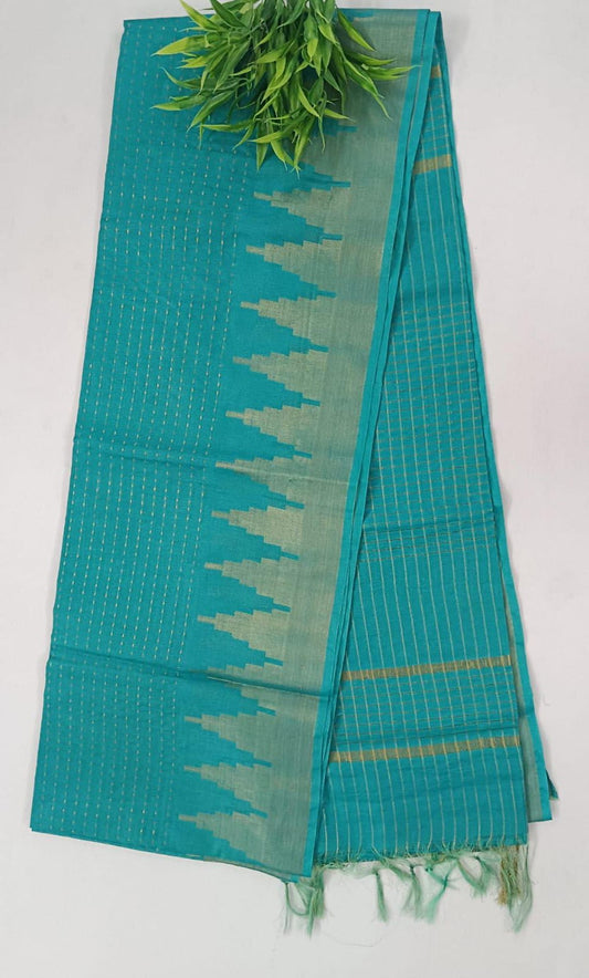 NVLCTB004-Linen cotton Temple border saree Aqua blue Color