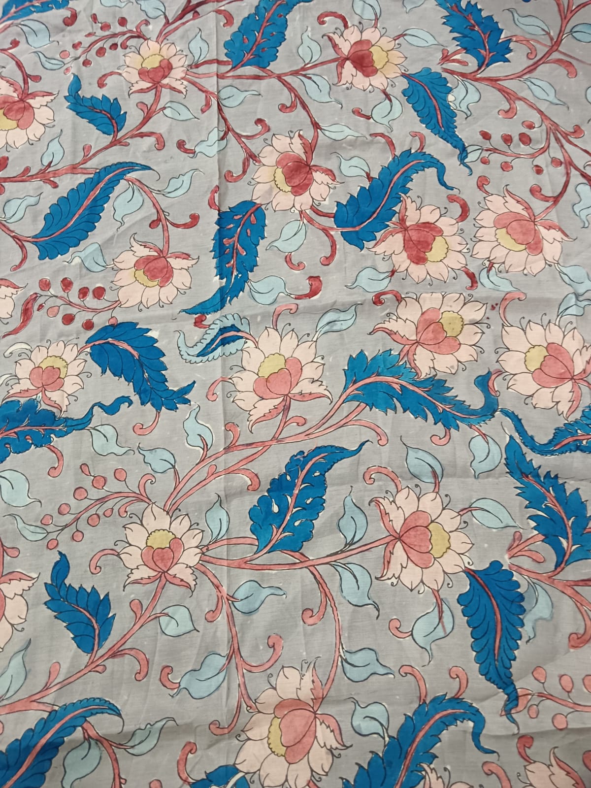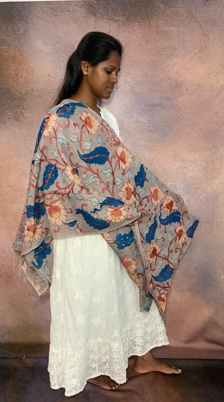 This Kalamkari material is perfect for creating garments, accessories, or home decor items that exude elegance and sophistication. Whether used to craft a flowing scarf, a graceful blouse, or a decorative wall hanging, its timeless beauty and understated charm are sure to captivate the imagination and add a touch of natural grace to any ensemble or living space.