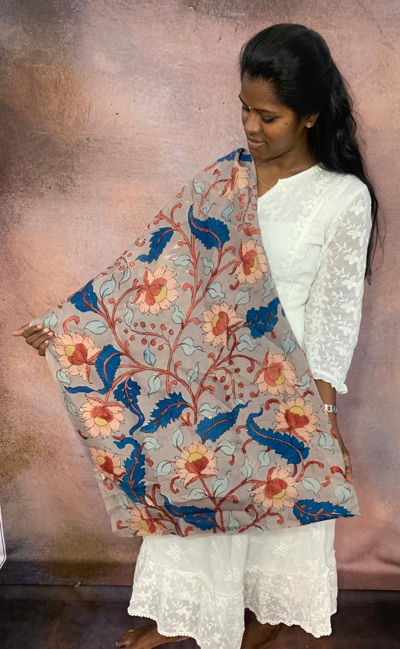 This elegant Kalamkari material features a soft and delicate Pale Olive Green backdrop adorned with beautifully blossomed flowers, creating a serene and enchanting aesthetic. The Pale Olive Green hue exudes a subtle warmth and tranquility, evoking the gentle beauty of nature's landscapes.