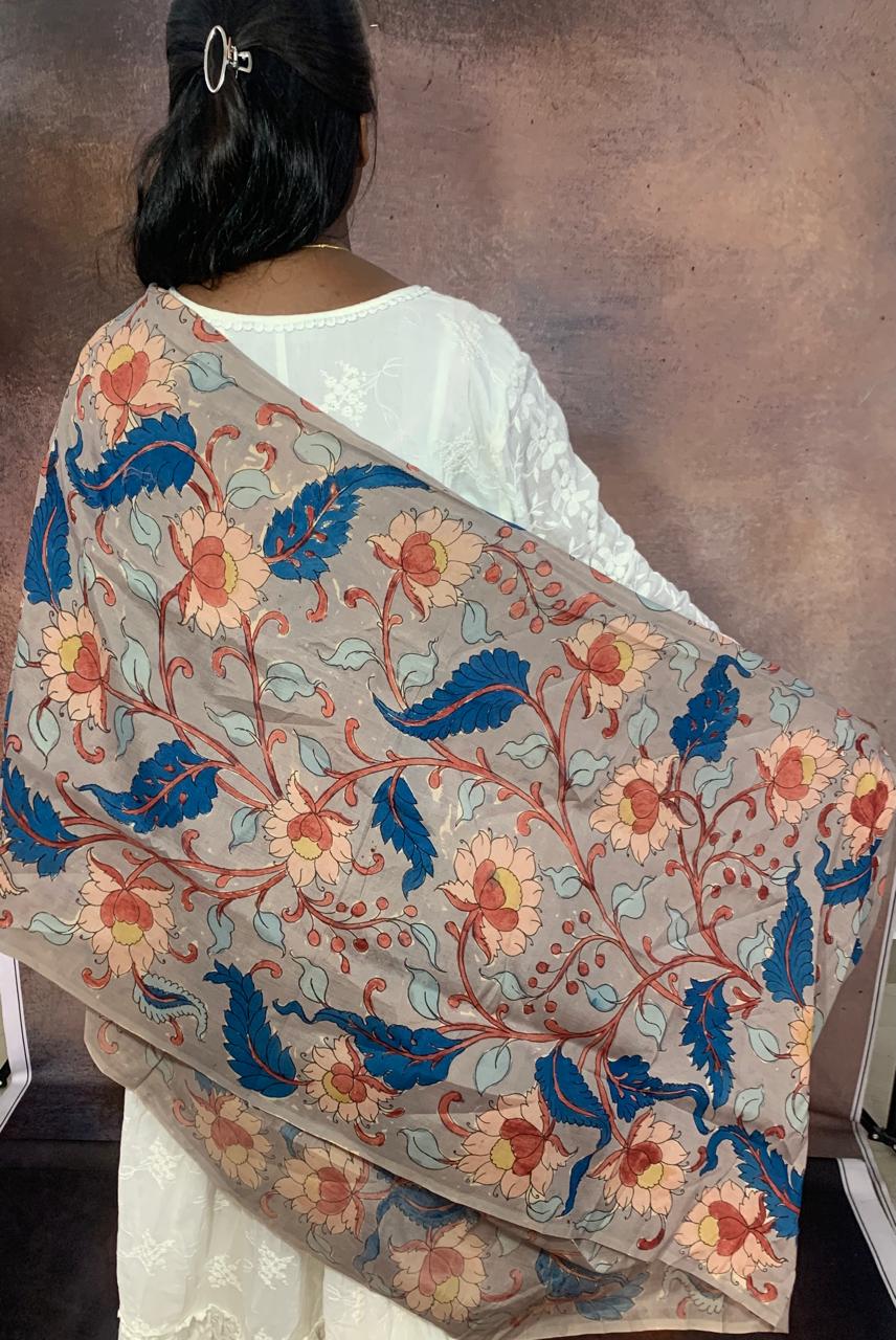 The interplay of the Pale Olive Green background with the blossomed flowers creates a sense of harmony and balance, with the subtle green tones serving as a serene backdrop to showcase the delicate beauty of the floral motifs. Each flower is meticulously hand-painted using the traditional Kalamkari technique, imbuing the fabric with a sense of craftsmanship and artistry.