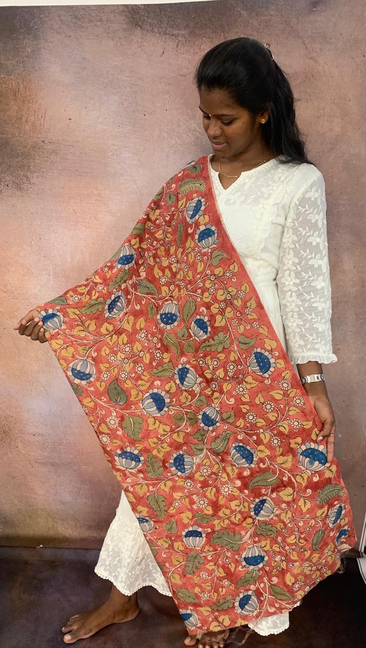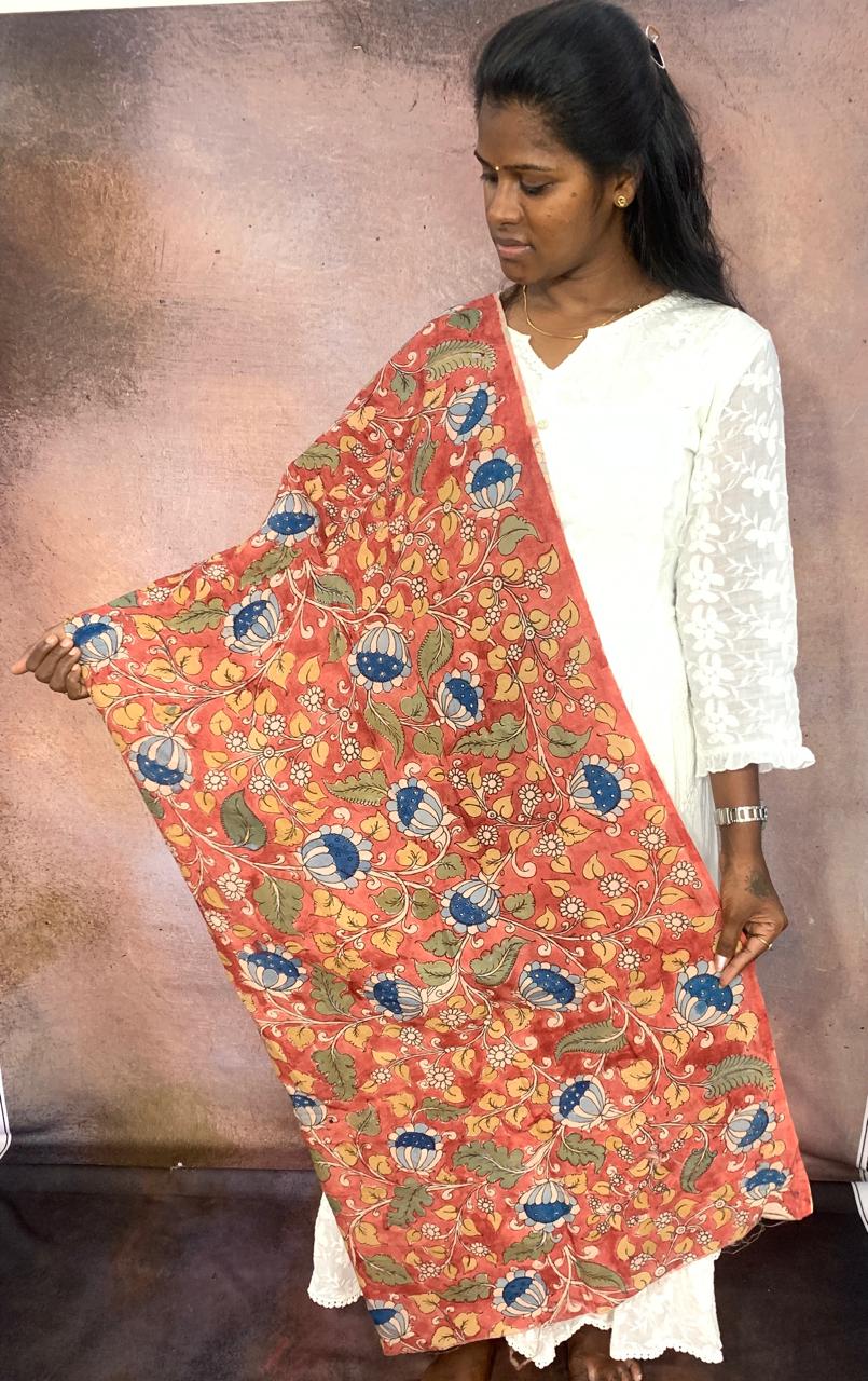 Adorning this rich backdrop are delicate blossom flowers in shades of Blue, their intricate petals unfurling with grace and beauty against the vivid orange canvas. Each blossom is meticulously hand-painted using the traditional Kalamkari technique, showcasing the artisan's skill and attention to detail.