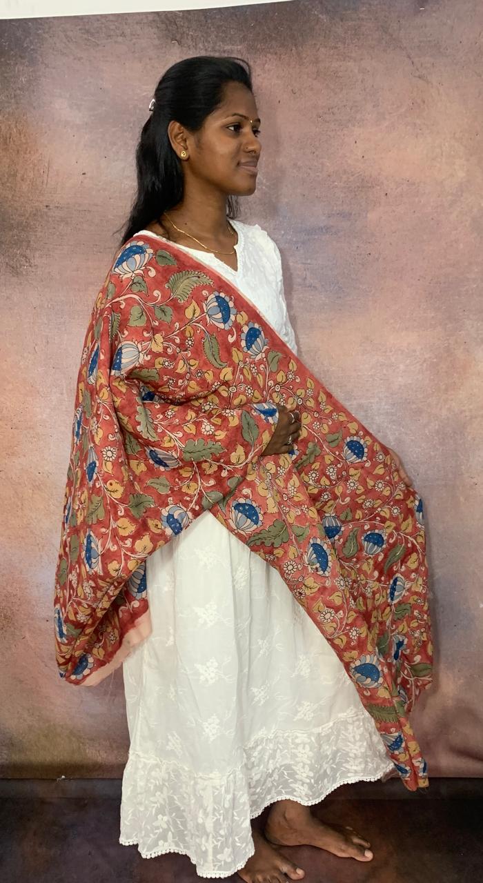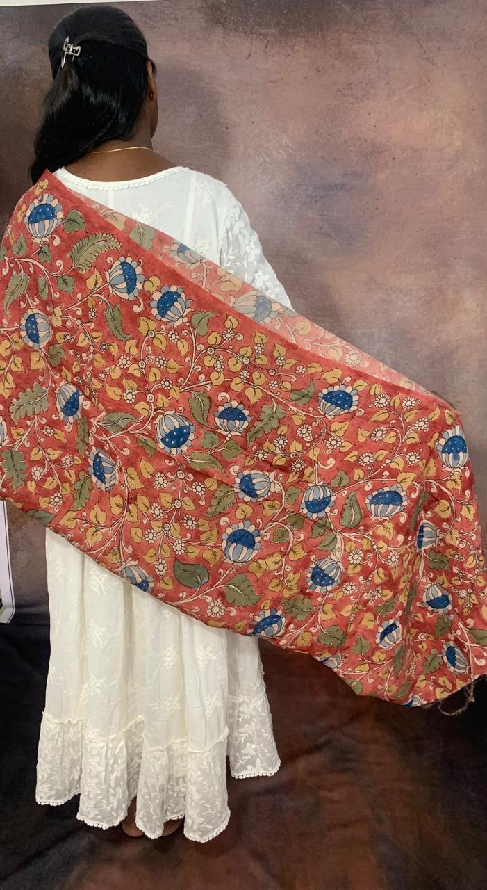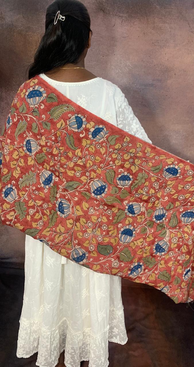 This Kalamkari material offers endless possibilities for creative expression, whether used to craft exquisite garments, accessories, or home decor items. Its vibrant colors and intricate floral motifs add a touch of elegance and sophistication to any project, making it a timeless choice for those who appreciate artistry and craftsmanship.