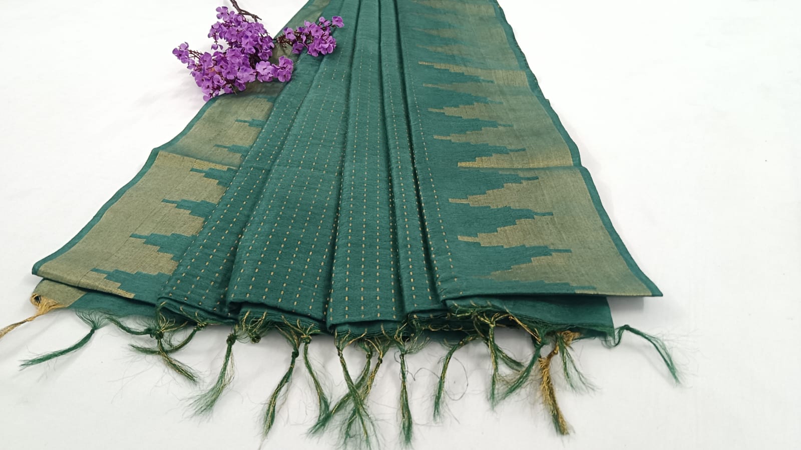 NVLCTB007-Linen cotton Temple border saree Dark Green Color