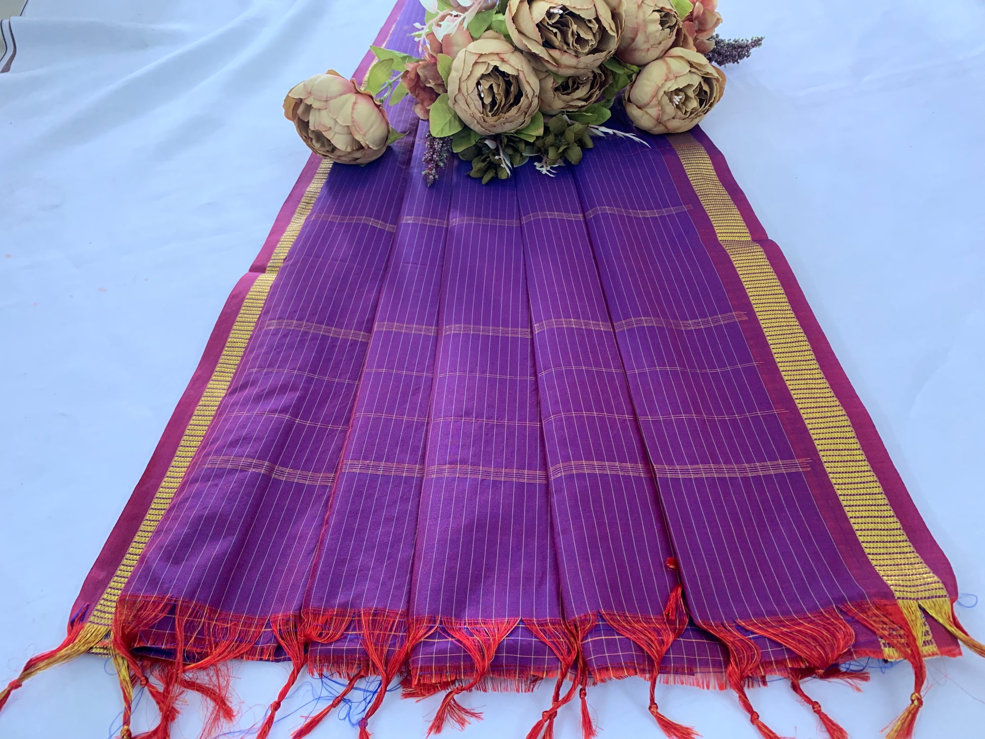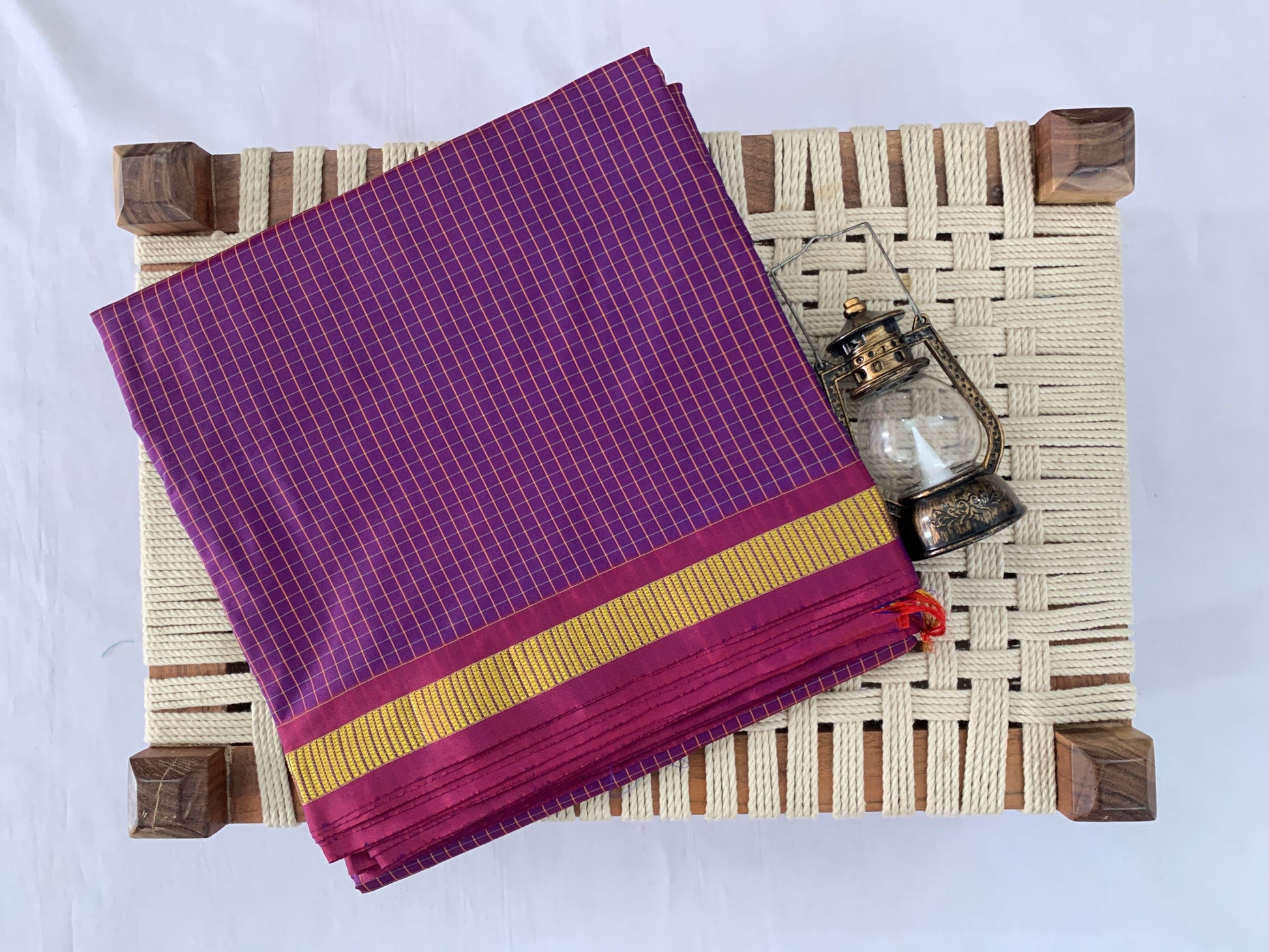 It seems like you're describing a saree with a violet color and a checked border. Sarees are traditional Indian garments typically worn by women, consisting of a length of cloth draped elegantly around the body, with one end usually draped over the shoulder.