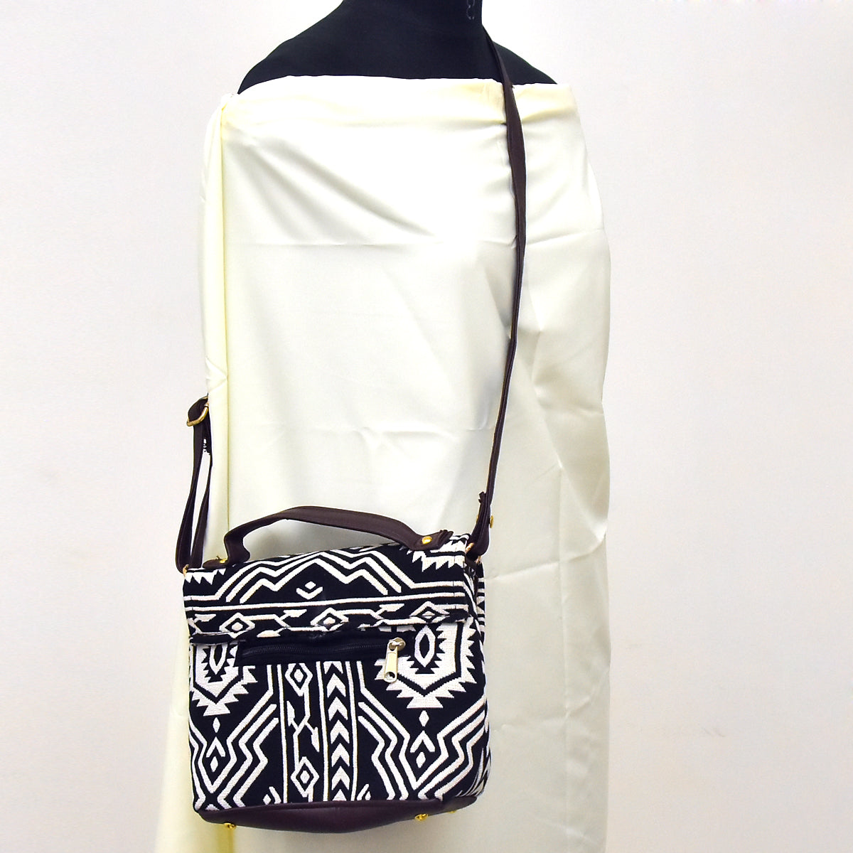 TVM01- Monochrome Chic: Black & White Jacquard Cloth and Leather Sling Bag